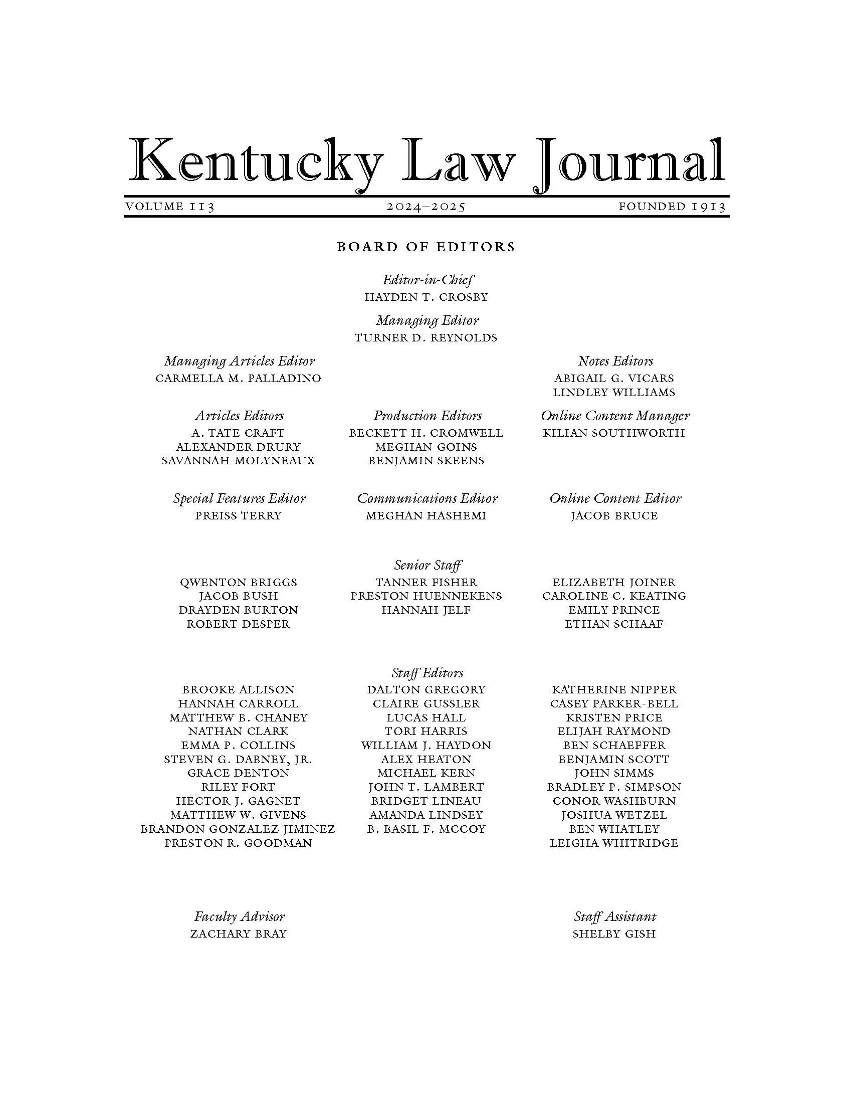 First Row (L to R): Zach Bray (Faculty Advisor); Elijah Raymond (Articles Editor); Ben Whatley (Managing Articles Editor) Casey Parker-Bell (Editor-in-Chief); Katherine Nipper (Managing Editor); Emma Collins (Managing Development Editor); Amanda Lindsey (Notes Editor); Leigha Whitridge (Notes Editor).
